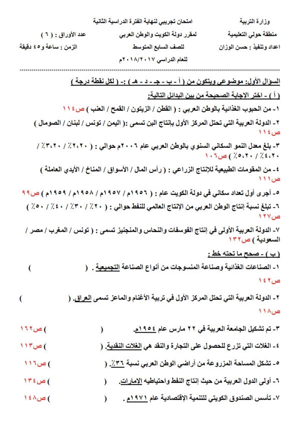امتحان تجريبي في الاجتماعيات للصف السابع الفصل الثاني 2018 2019