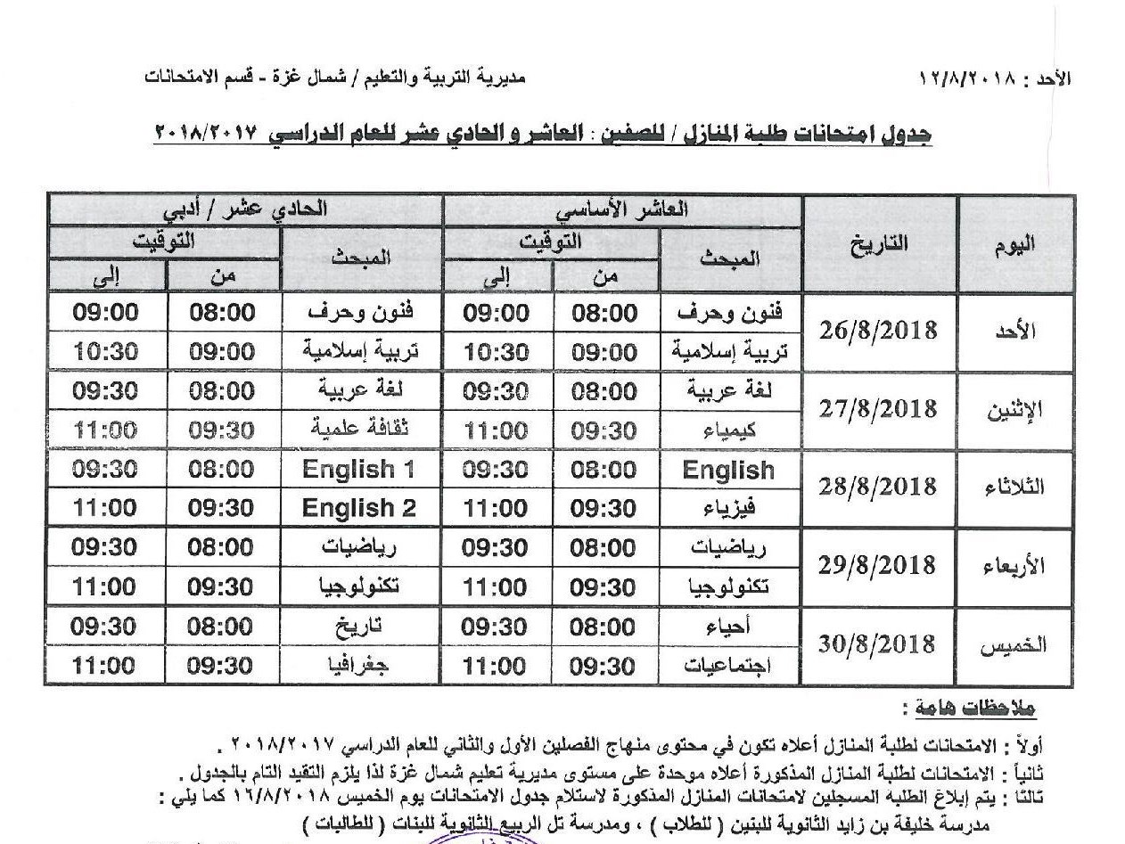 جدول امتحانات طلبة المنازل لمرحلتي عاشر و حادي عشر 2017 2018