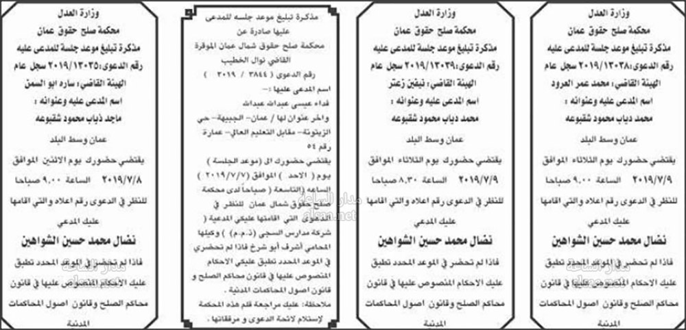 إخطارات عن دوائر التنفيذ ومذكرات تبليغ مواعيد جلسات أسماء